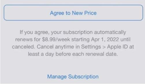 援引科技媒體 TechCrunch 報道,蘋(píng)果似乎正在測試一項新功能,允許開(kāi)發(fā)者在訂閱價(jià)格上調后自動(dòng)向用戶(hù)收費。當前,當訂閱費用上調的時(shí)候,蘋(píng)果要求需要獲得用戶(hù)的明確同意。如果客戶(hù)不點(diǎn)擊呈現的“同意新價(jià)格”按鈕,他們的訂閱會(huì )被自動(dòng)取消。