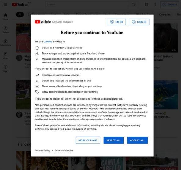 為了解決這個(gè)問(wèn)題,谷歌的新 Cookie Rejection Banner 提供了清晰、平衡的選擇,包括了“拒絕所有”(reject all)、“接受所有”(accept all)或“更多選項”(more options)等按鈕。如果用戶(hù)沒(méi)有登錄賬號,新菜單將出現在谷歌搜索和 YouTube 上。