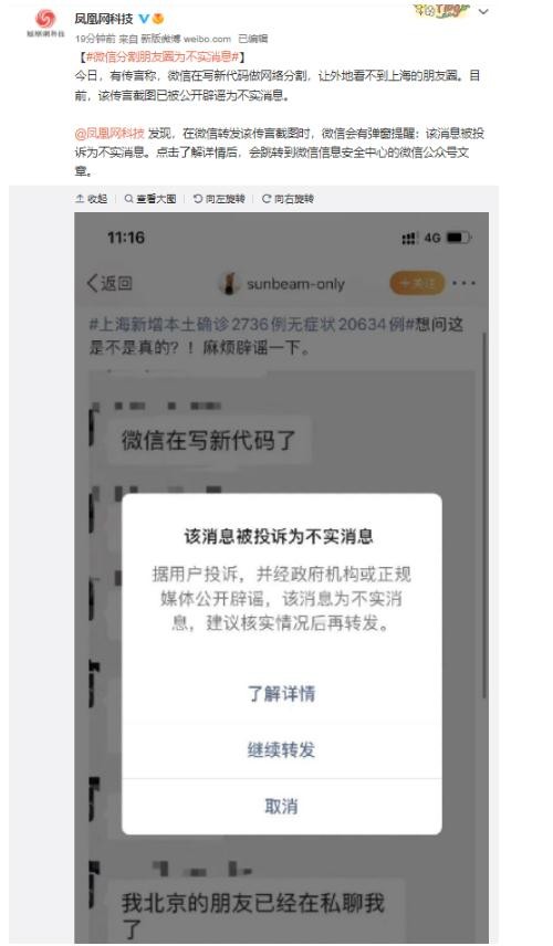 今日,有傳言稱(chēng),微信在寫(xiě)新代碼做網(wǎng)絡(luò )分割,讓外地看不到上海的朋友圈。目前,該傳言截圖已被公開(kāi)辟謠為不實(shí)消息。