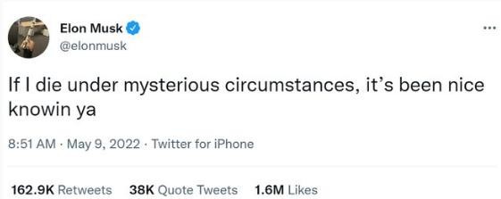 “如果我神秘地死亡,很高興認識你。” 馬斯克在推特上寫(xiě)道,但并未對此作詳細說(shuō)明。