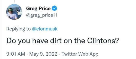 不過(guò),馬斯克的粉絲并沒(méi)有將他的發(fā)言與羅戈津的來(lái)往聯(lián)系起來(lái)。相反,很多人開(kāi)玩笑說(shuō),馬斯克一定有“克林頓夫婦的黑料”(dirt on the Clintons),指與比爾·克林頓和希拉里·克林頓有某種聯(lián)系的人往往會(huì )神秘死亡。例如 1993 年白宮副顧問(wèn)文森·弗斯特(Vince Foster)的自殺,2016 年民主黨全國委員會(huì )工作人員塞斯·里奇 (Seth Rich)被武裝搶劫槍殺,以及億萬(wàn)富翁戀童癖者杰弗里·愛(ài)潑斯坦(Jeffrey Epstein)被官方裁定自殺的神秘死亡。