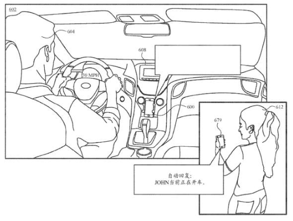 從專(zhuān)利圖可以看到,當用戶(hù)在開(kāi)車(chē)時(shí),iPhone 手機將自動(dòng)回復“JOHN(用戶(hù)名稱(chēng))當前正在開(kāi)車(chē)”,似乎會(huì )檢測用戶(hù)的車(chē)速,從而自動(dòng)開(kāi)啟該功能。