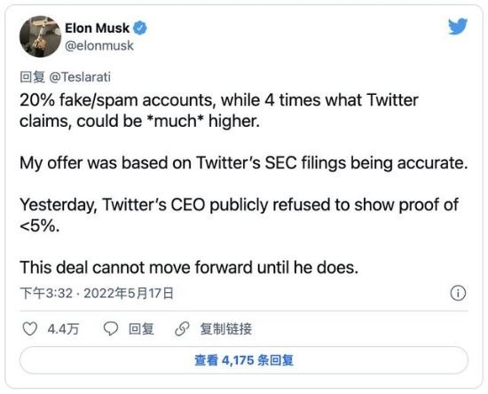當地時(shí)間 5 月 17 日,馬斯克在推特上發(fā)文稱(chēng),除非推特提供證據證明其虛假用戶(hù)數量的比例,否則“這筆交易無(wú)法推進(jìn)”。
