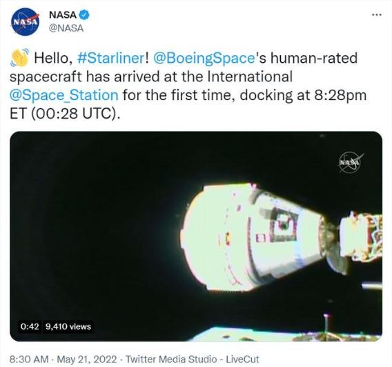 美國國家航空航天局(NASA)官方推特 5 月 20 日發(fā)布消息稱(chēng),波音公司星際客船(Starliner)于美國東部時(shí)間 20 日 20:28(北京時(shí)間 5 月 21 日8:28)與國際空間站對接。