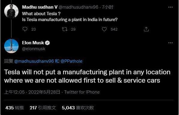周五當天,有粉絲在推特上詢(xún)問(wèn)特斯拉在印度建廠(chǎng)的最新情況,馬斯克回應道:“只有首先被允許銷(xiāo)售和維修汽車(chē),特斯拉才會(huì )考慮在印度建立制造廠(chǎng)。”