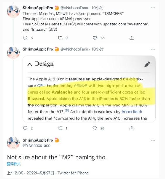 他表示,下一款 M 系列芯片 ——M2(未定名)將基于 3nm 工藝(TSMCFF3)打造,而且是 Apple 定制的 Arm v9 架構處理器(目前的 A15 是 Arm v8)。此前,蘋(píng)果 M1 系列的終極 SoC——M1X (未定名) 將配備更新的核心“雪崩”和“暴雪”。