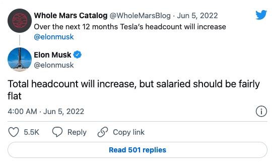 一個(gè)未經(jīng)驗證的推特賬戶(hù)發(fā)文稱(chēng),特斯拉的員工人數將在未來(lái) 12 個(gè)月增加。馬斯克隨后在下面回復稱(chēng):“員工總量將增加,但受薪員工人數應該相當平穩。”