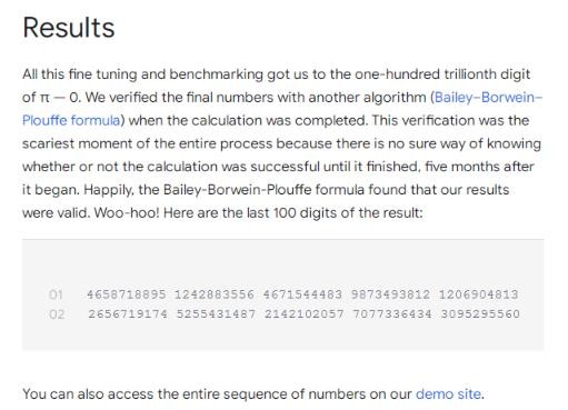 谷歌云的計算結果顯示,100 萬(wàn)億位圓周率數字的最后 100 位數字是:4658718895 1242883556 4671544483 9873493812 1206904813 2656719174 5255431487 2142102057 7077336434 3095295560。