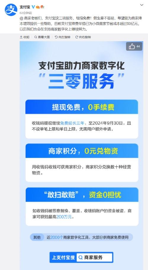支付寶再添新舉措:6 月 10 日,支付寶開(kāi)放平臺宣布面向小微商家推出“三零服務(wù)”,平臺通過(guò)提現免費、被盜全賠、免費權益等為小微商家降本提效,其中降費舉措已為小微節省成本超過(guò) 50 億元。