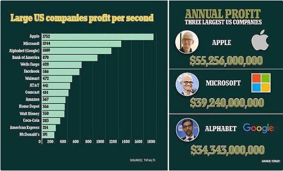 微軟和 Alphabet 每秒也能賺 1000 多美元,但比爾?蓋茨創(chuàng )辦的公司比 Alphabet 多賺 150 美元,算下來(lái)每天也能賺 1 億美元,這個(gè)數字同樣令人瞠目結舌。