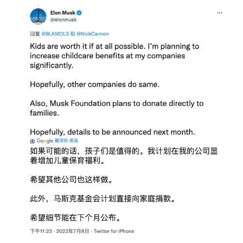 “如果可能的話(huà),孩子是值得的。我計劃大幅提高公司的托兒福利。希望其他公司也能這樣做。此外,馬斯克基金會(huì )計劃直接向家庭捐款。希望下個(gè)月能公布細節。”馬斯克回復稱(chēng)。