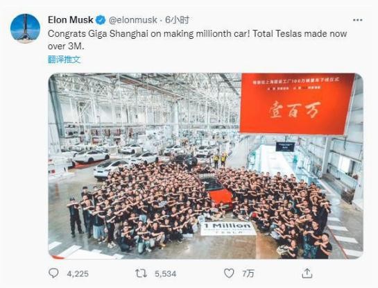 馬斯克發(fā)文稱(chēng)已生產(chǎn)300多萬(wàn)輛電動(dòng)汽車(chē) 上海工廠(chǎng)總產(chǎn)量達100萬(wàn)輛 11:48:22