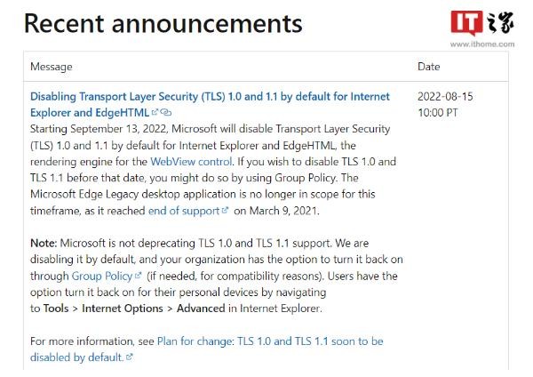 微軟 8 月 15 日公布了更新計劃,將于 2022 年 9 月 13 日在 Internet Explorer 和 EdgeHTML(舊版 Edge 瀏覽器的內核)中禁用 WebView 控件的 TLS 1.0 和 1.1(傳輸層安全協(xié)議)。