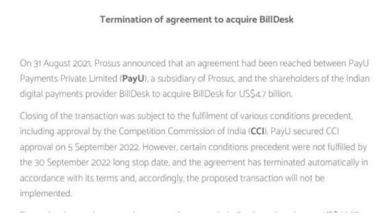 目前還不清楚 Prosus 和 BillDesk 是否已就終止費達成協(xié)議。