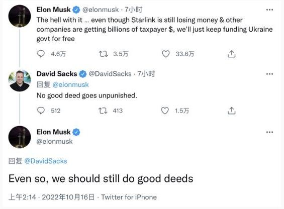 隨后,在馬斯克表示 SpaceX 不能無(wú)限期地出資烏克蘭的“星鏈”項目時(shí),有人提及馬斯克此前曾被罵“滾”。就此,馬斯克在評論區回復:我只是按他的建議去做了。