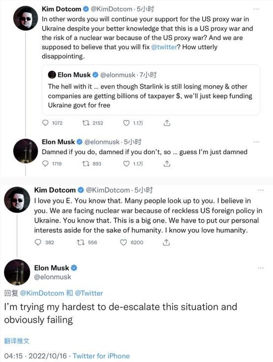 隨后,這名推特用戶(hù)接著(zhù)說(shuō):“我喜歡你埃隆,你知道的。很多人都尊敬你。我相信你。由于美國在烏克蘭魯莽的外交政策,我們正面臨核戰爭。你知道的。這是個(gè)大問(wèn)題。為了人類(lèi)的利益,我們必須把個(gè)人利益放在一旁。我知道你熱愛(ài)人類(lèi)。”就此,馬斯克回答說(shuō):“我嘗試盡最大的努力以緩解這種情況,但顯然我失敗了。”