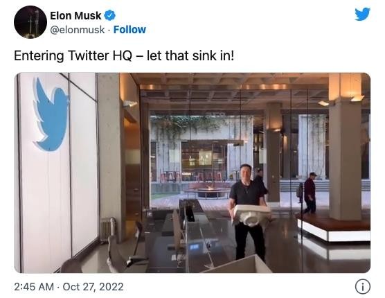 世界首富埃隆?馬斯克 (Elon Musk) 周三現身推特舊金山總部,他發(fā)布了一段自己抱著(zhù)廚房水槽走進(jìn)辦公室的視頻,并將自己的公開(kāi)簡(jiǎn)介改為“推特領(lǐng)袖”(Chief Twit)。