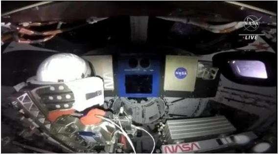獵戶(hù)座在升空約 2 小時(shí)后脫離火箭,宇宙飛船內外配備 16 個(gè)鏡頭,以便從不同的角度拍攝繞月飛行任務(wù)。圖片顯示,升空 9 小時(shí)后鏡頭拍到獵戶(hù)座一角及部分地球圖像,并有假人指令長(cháng)坎波斯(Moonikin Campos)坐在艙內的照片。假人以 NASA 已故工程師坎波斯命名,他是當年把“阿波羅 13 號”宇航員安全送返地球的功臣之一。