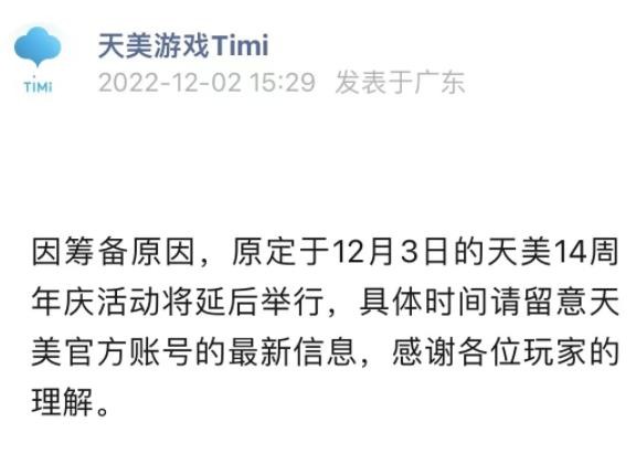 天美游戲公告,因籌備原因,原定于 12 月 3 日的天美 14 周年慶活動(dòng)將延后舉行,具體時(shí)間請留意天美官方賬號的最新信息,感謝各位玩家的理解。