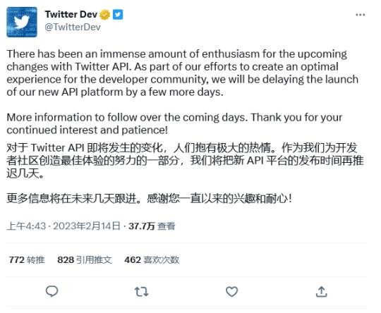 Twitter 隨后將上線(xiàn)日期推遲到了 2 月 13 日。但距離正式上線(xiàn)還有幾個(gè)小時(shí)的時(shí)候,官方現在再次發(fā)布推文,表示再推遲幾天時(shí)間。推文中并未明確具體的上線(xiàn)時(shí)間。