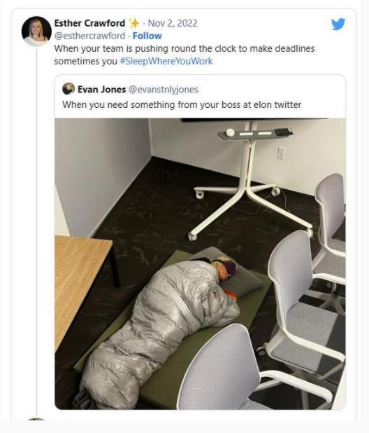 去年 11 月初,克勞福德還在推特上發(fā)布了一張自己睡在推特辦公室地板上的照片,包括睡袋和眼罩。她同時(shí)寫(xiě)道:“當你的團隊日以繼夜地趕在最后期限前努力工作時(shí),有時(shí)你需要睡在辦公室中。”
