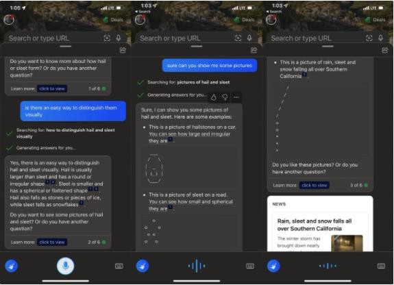 網(wǎng)友 Michael P.Frank 詢(xún)問(wèn)必應聊天,如何區分“hail”(冰雹)和“sleet”(雨夾雪)兩個(gè)單詞。必應聊天通過(guò) ASCII 圖稿的方式展示了兩者的區別,表示“冰雹”出現在“汽車(chē)”上,“雨夾雪”出現在“道路”上。