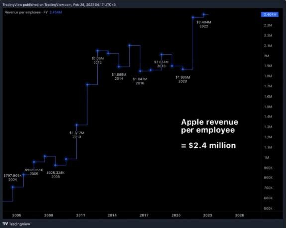 根據 Barron’s 發(fā)布的最新報告,引用 FaceSet 的數據,如果將蘋(píng)果在 2022 財年創(chuàng )造的收入進(jìn)行分攤,那么每位員工創(chuàng )造了 240 萬(wàn)美元的收入。在過(guò)去五年中,以同樣的指標計算,平均收入約為 210 萬(wàn)美元。