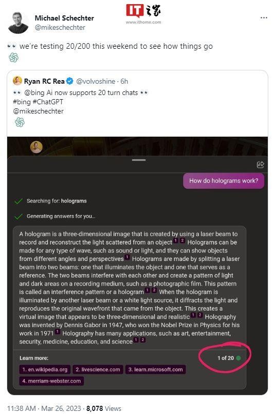 微軟必應聊天再次提高聊天次數限制 現每次會(huì )話(huà)可進(jìn)行20次聊天 09:12:44