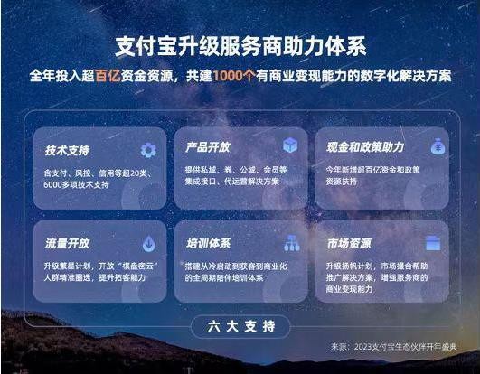 支付寶平臺宣布,升級生態(tài)服務(wù)商助力體系:通過(guò)技術(shù)支持、產(chǎn)品開(kāi)放、培訓體系、流量開(kāi)放、現金和政策助力、市場(chǎng)推廣資源等 6 大支持,幫服務(wù)商實(shí)現快速冷啟動(dòng)、精準獲客和提高商業(yè)變現能力。