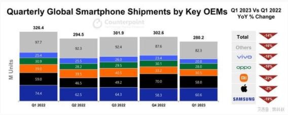 Counterpoint 公布的數據顯示,Q1 手機銷(xiāo)量 TOP5 品牌為三星、蘋(píng)果、小米、OPPO 和 vivo,對應的出貨量和降幅分別為 (三星)6060 萬(wàn)部、同比下降 19%,(蘋(píng)果)5800 萬(wàn)部、同比下降2%,(小米)3050 萬(wàn)部、同比下降 22%,(OPPO)2800 萬(wàn)部、同比下降 10%,(vivo)2080 萬(wàn)部,同比下降 18%。全球智能手機市場(chǎng)整體出貨量為 2.802 億部,同比下降 14%。