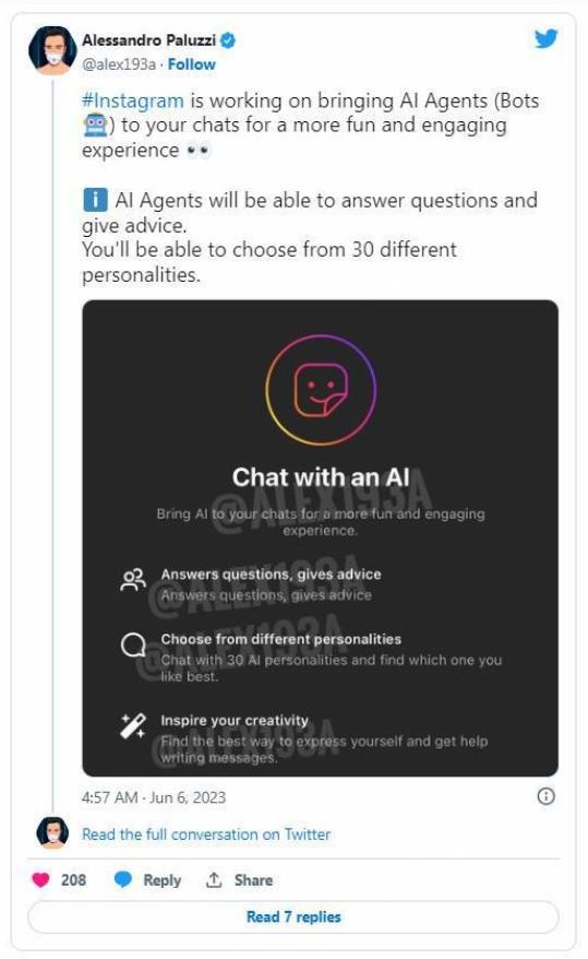 一條推文透露,Instagram 正在為其平臺測試人工智能聊天機器人。有了這項新功能,用戶(hù)將能夠與聊天機器人對話(huà),在他們的直接消息中提出問(wèn)題并獲得建議。