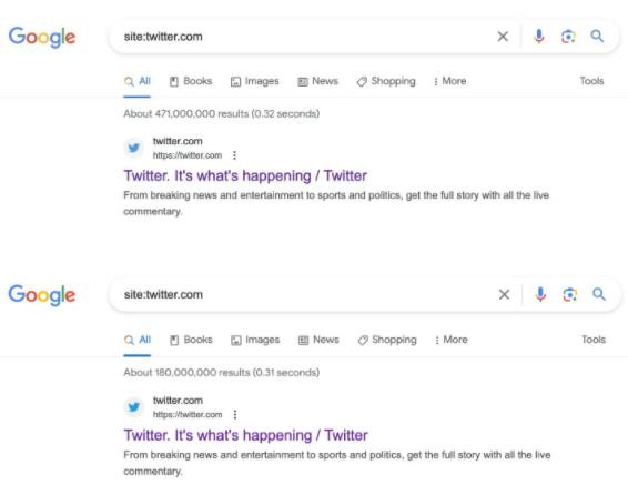 報道中指出推特在上周五施行“新規”之后,Google Search 刪除了超過(guò)一半的推特索引 URL 地址,被谷歌索引的推文數量從 4.71 億條銳減至 1.8 億條,這意味著(zhù)谷歌對 Twitter.com 的索引飽和度下降了 62%。