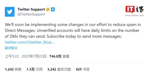 IT之家此前報道,自 6 月以來(lái),Twitter 已經(jīng)多次調整針對未付費用戶(hù)的私信限制,馬斯克和 Twitter 官方一直都強調此舉是為了減少垃圾消息的產(chǎn)生。與此同時(shí),Twitter 在 7 月初也限制了非付費用戶(hù)每日的推文瀏覽量,最初為 600 條,后來(lái)調整為 1000 條,Twitter 方面也解釋稱(chēng)此舉是一種反抓取措施。