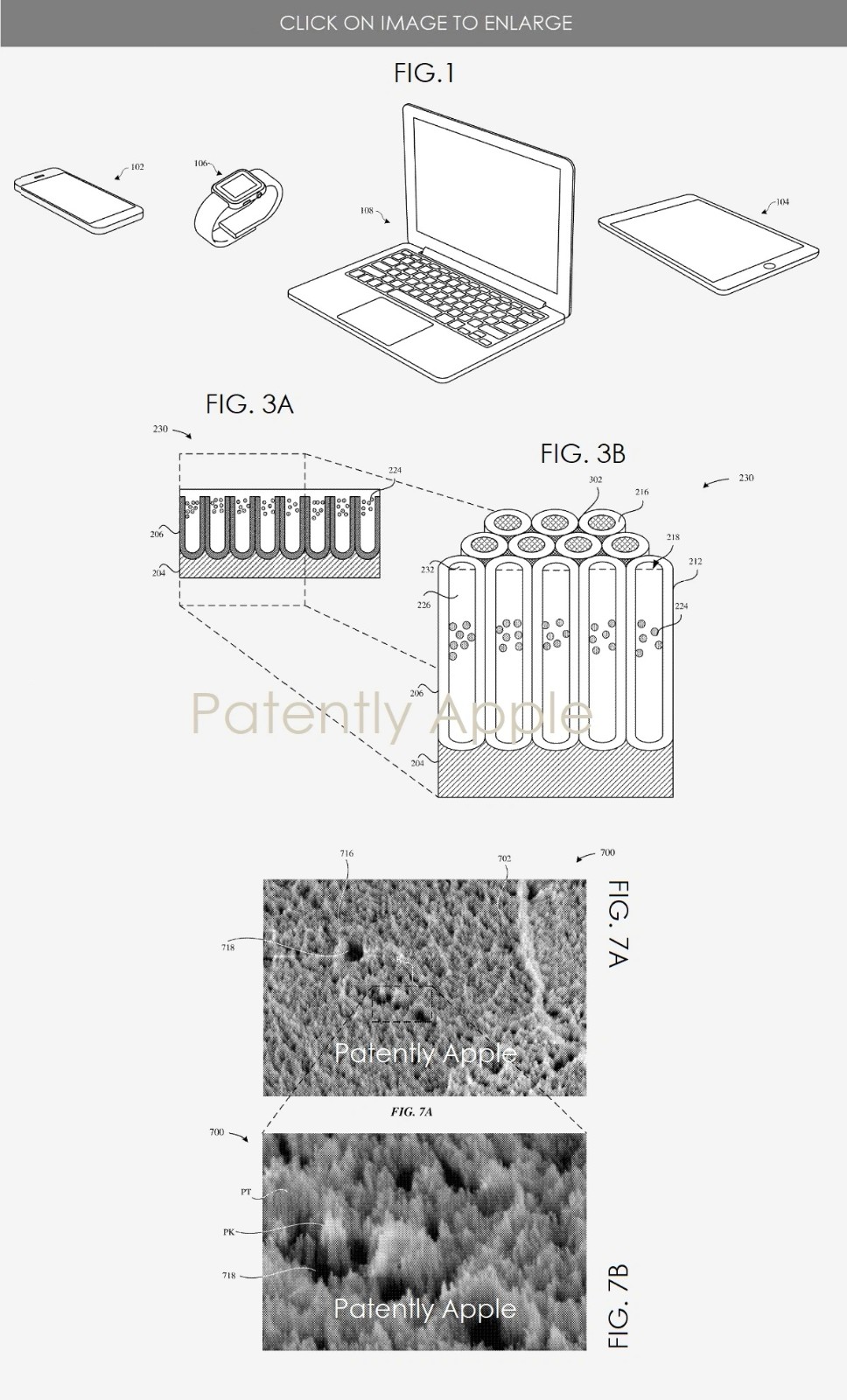 蘋(píng)果圖 1 部分展示了極端亞光黑的設備,包括 iPhone、Apple Watch、MacBook 和 iPad;而圖 3A 到 3B 展示經(jīng)歷蝕刻工藝之前的陽(yáng)極化部件視圖;圖 7A 和 7B 展示具有光吸收特征的陽(yáng)極化部件的示例性圖像。