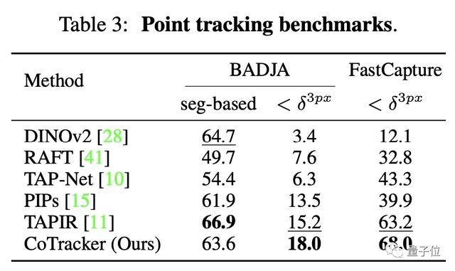在 FastCapture 數據集測試上,CoTracker 的成績(jì)在一眾模型中脫穎而出,其中也包括 Meta 自家的 DINOv2。