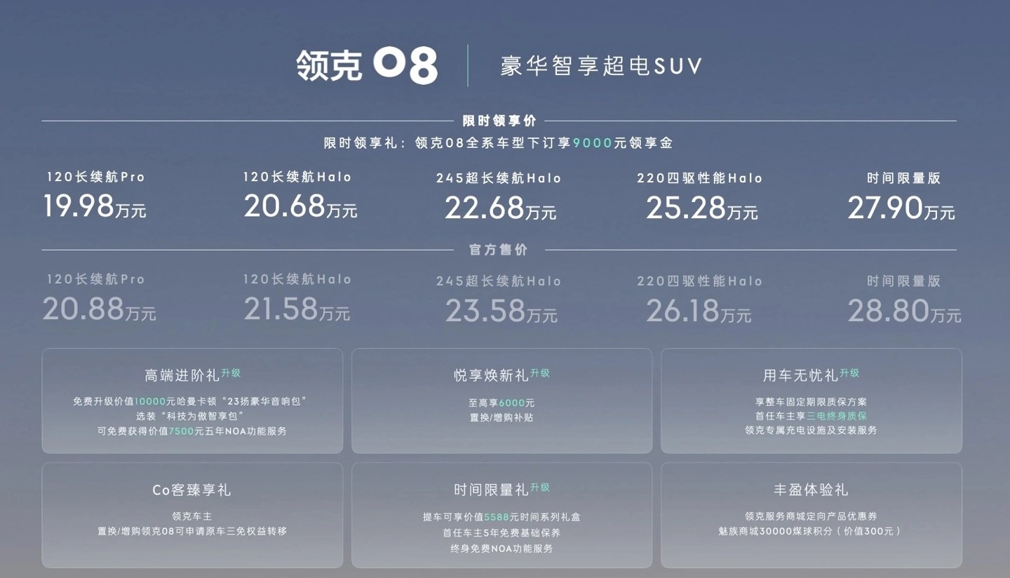 領(lǐng)克旗下定位為“豪華智享超電 SUV ”的全新車(chē)型 —— 領(lǐng)克 08,在時(shí)隔將近半年的預熱之后,已于今晚正式上市。新車(chē)推出 5 款不同配置,售價(jià)區間為 20.88 萬(wàn)元-28.80 萬(wàn)元。此外,領(lǐng)克汽車(chē)還推出全系車(chē)型下訂享 9000 元的“限時(shí)領(lǐng)享禮”,相當于該車(chē)起售價(jià)為 19.98 萬(wàn)元。附不同車(chē)型價(jià)格如下:
