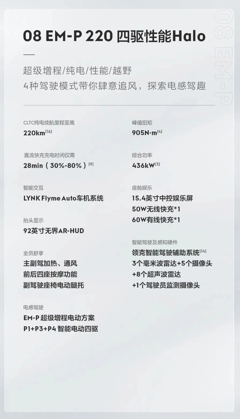 三電機四驅版的領(lǐng)克 08 采用 1.5T 電混發(fā)動(dòng)機和三電機(P1+P3+P4)布局,綜合功率 436kW,最高扭矩可達 905N?m,官方宣稱(chēng)百公里加速時(shí)間為 4.6 秒。