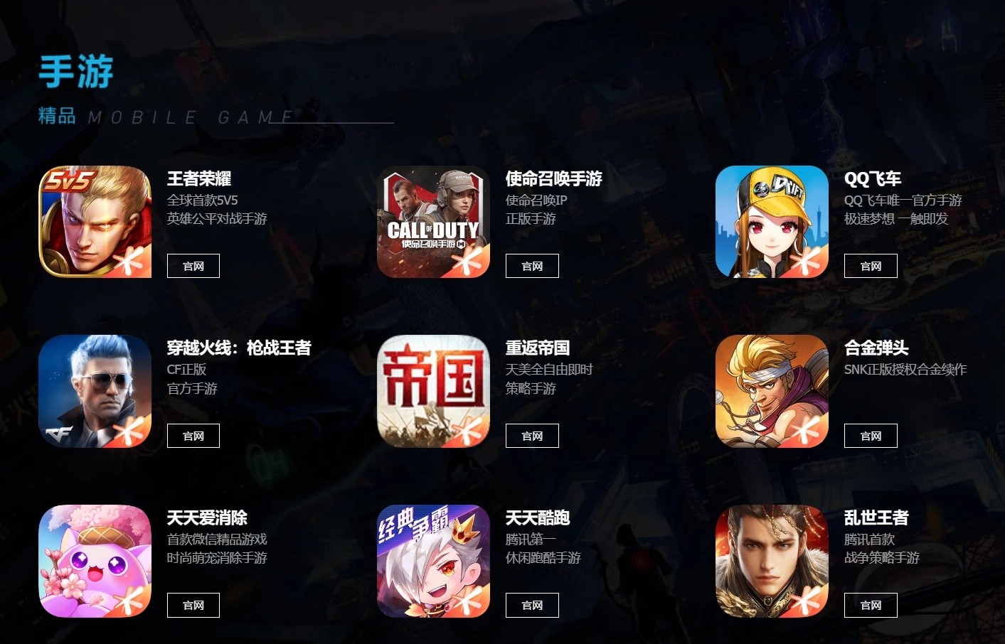 天美工作室群官網(wǎng),該工作室群擁有《王者榮耀》《QQ 飛車(chē)》手游、《穿越火線(xiàn):槍?xiě)鹜跽摺贰短焯鞇?ài)消除》等熱門(mén) IP。