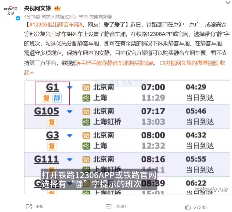 今日早間,“12306 推出靜音車(chē)廂”登頂微博熱搜榜,鐵路部門(mén)在京滬,京廣,成渝高鐵等部分復興號動(dòng)車(chē)組列車(chē)上設置了靜音車(chē)廂。