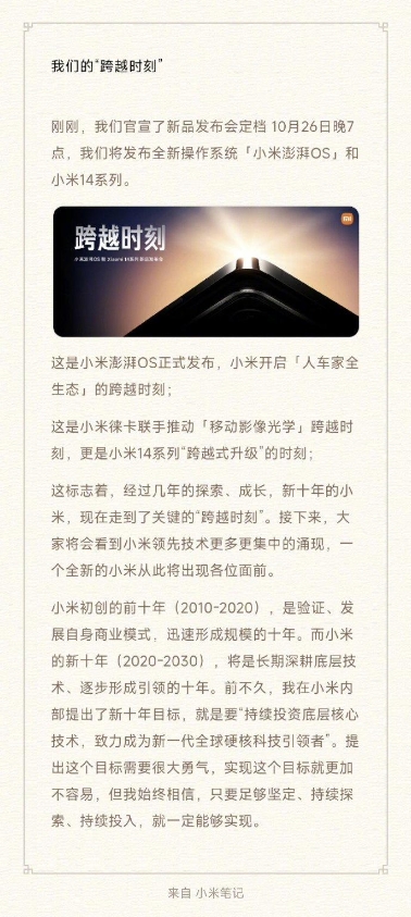 在小米官宣新品發(fā)布會(huì )定檔 10 月 26 日晚 7 點(diǎn)之后不久,小米創(chuàng )始人雷軍發(fā)文稱(chēng),此次發(fā)布會(huì )將是小米澎湃 OS 正式發(fā)布、小米開(kāi)啟“人車(chē)家全生態(tài)”的跨越時(shí)刻,也是小米徠卡聯(lián)手推動(dòng)“移動(dòng)影像光學(xué)”的跨越時(shí)刻,更是小米 14 系列“跨越式升級”的時(shí)刻。