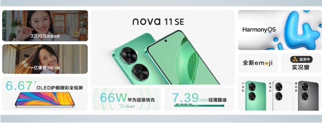 據介紹,華為 nova 11 SE 將采用星耀環(huán)鏡頭模組設計,擁有 3 款配色:11 號色、雪域白、曜金黑,厚度 7.39mm,重量 186g。