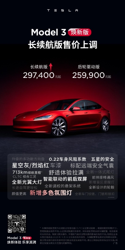 Model 3 長(cháng)續航煥新版售價(jià)調整為 29.74 萬(wàn)元,此前為 29.59 萬(wàn)元,上調 1500 元。