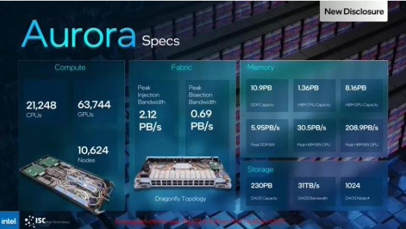 值得一提的是,Aurora 是基于 HPE Cray EX(英特爾百億億級計算芯片)所建造的,其中使用了英特爾 Xeon CPU Max 系列處理器和英特爾數據中心 GPU Max 系列加速器,并通過(guò) HPE 的 Slingshot-11 網(wǎng)絡(luò )進(jìn)行通信。