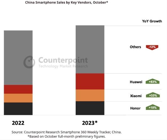 10月中國智能手機市場(chǎng)復蘇:華為銷(xiāo)量同比暴增83%,小米增33% 09:43:46