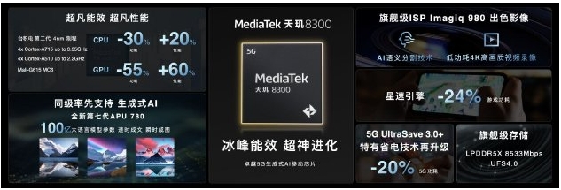 據官方介紹,作為天璣8000系列家族的新成員,天璣 8300擁有先進(jìn)的生成式AI技術(shù)與高能效特性,并且游戲體驗出色,同時(shí)具備高速穩定的網(wǎng)絡(luò )連接能力。