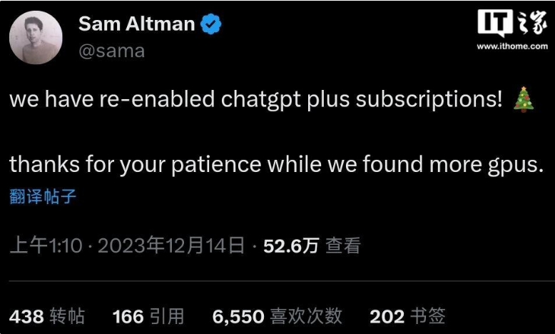 時(shí)隔近一個(gè)月,Sam Altman 今日宣布,已重新開(kāi)放 ChatGPT Plus 訂閱。“感謝您的耐心等待,我們找到了更多 GPU。”