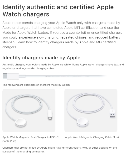 蘋(píng)果提供了正品 Apple Watch 充電器的圖像,并解釋了線(xiàn)纜上刻印的文字和防偽標記。