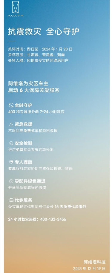 本次關(guān)懷服務(wù)時(shí)間為即日起至 2024 年 1 月 20 日,關(guān)懷范圍為甘肅省、青海省、新疆維吾爾自治區,關(guān)懷人群為因地震受災的阿維塔用戶(hù)。