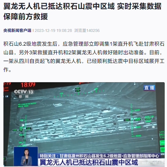 據央視軍事報道,翼龍-2H 應急救災型無(wú)人機 20 日從四川自貢蘭田機場(chǎng)起飛,再次飛赴甘肅省積石山縣,開(kāi)展災情偵察、應急通信保障等應急救災任務(wù)。